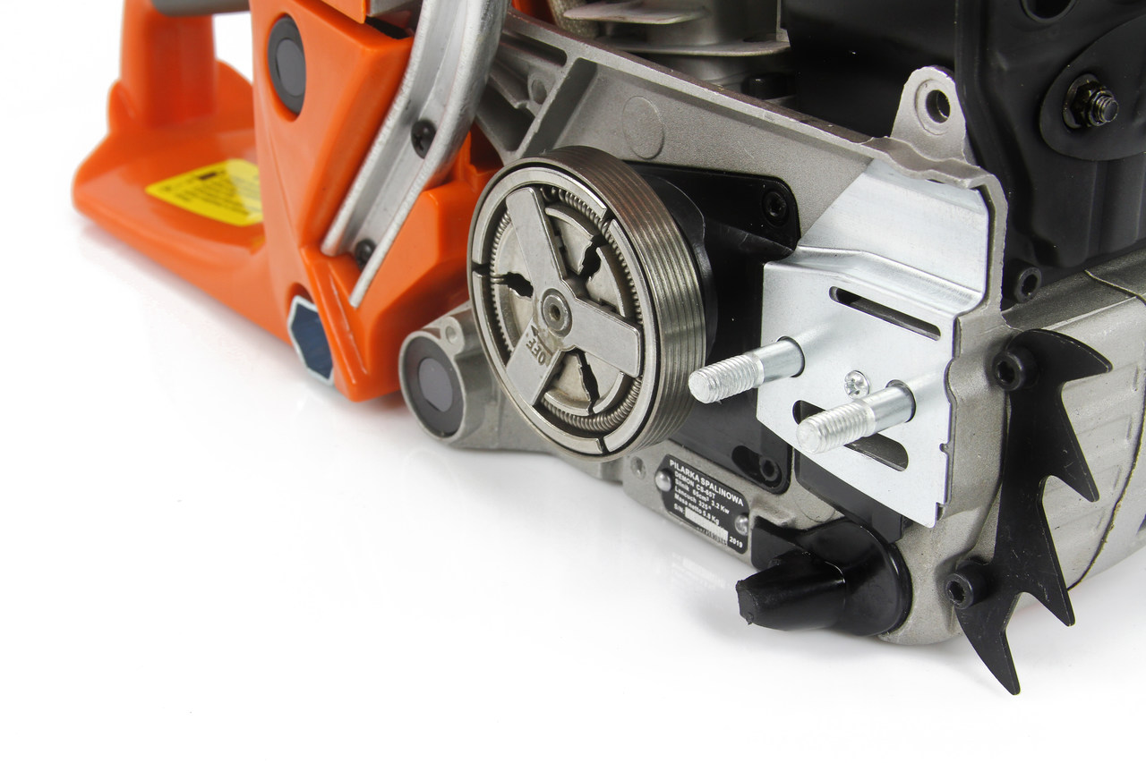 La motosega è dotata di un sistema frenante aggiuntivo, di un tensionatore rapido per la catena e di una pompa automatica per l'olio che regola la quantità di lubrificante in base alle esigenze dell'attrezzatura.
