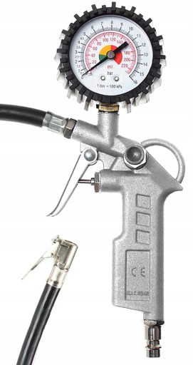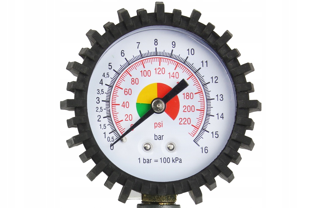 Dotata di un grande manometro ricoperto in gomma per prevenire danni accidentali, è capace di misurare da 0 a 16 bar/0-220 PSI.
