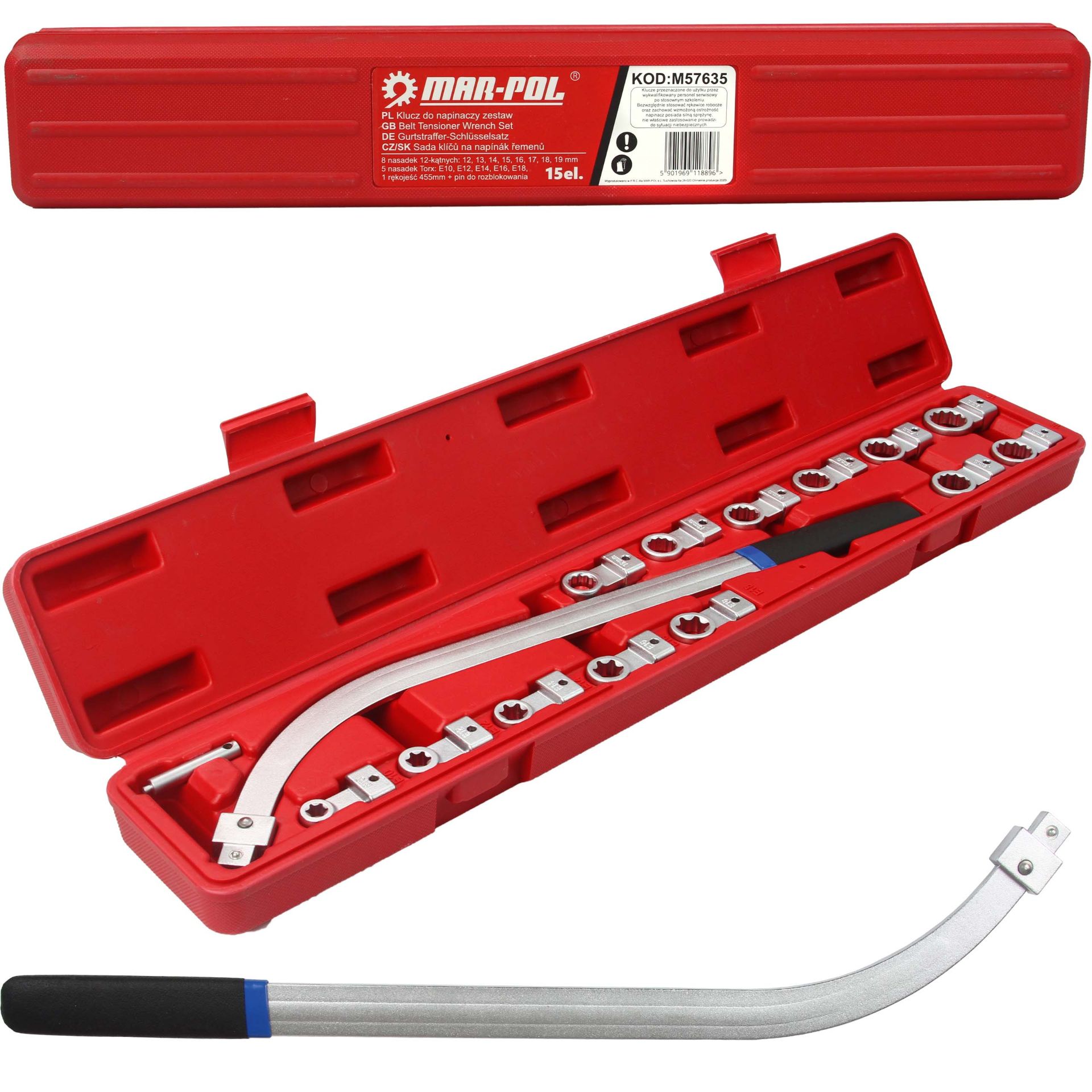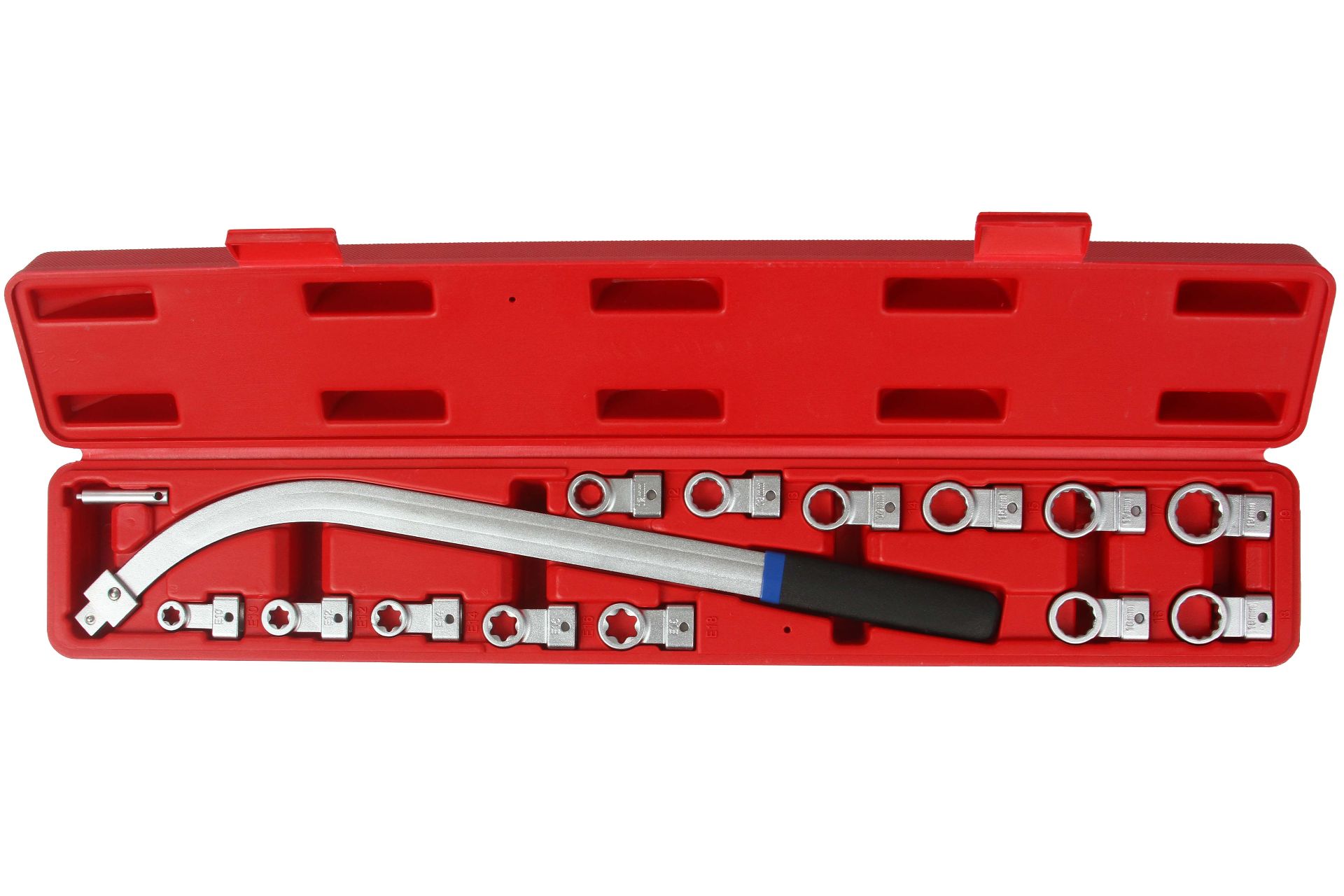 Set per Smontaggio di Tensionatori | 15 Pezzi | Chiave a Manico Piegato 45,5 cm | Punte TORX E10-16 | Bussole a 12 Angoli 12-19 mm