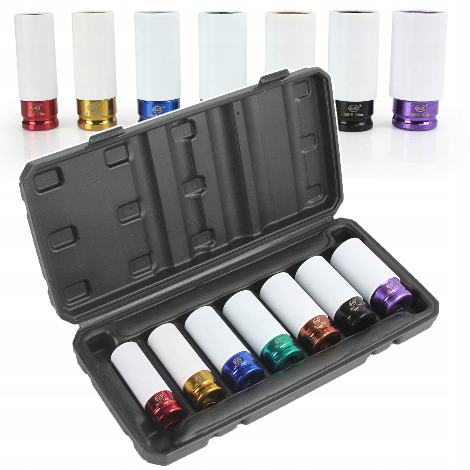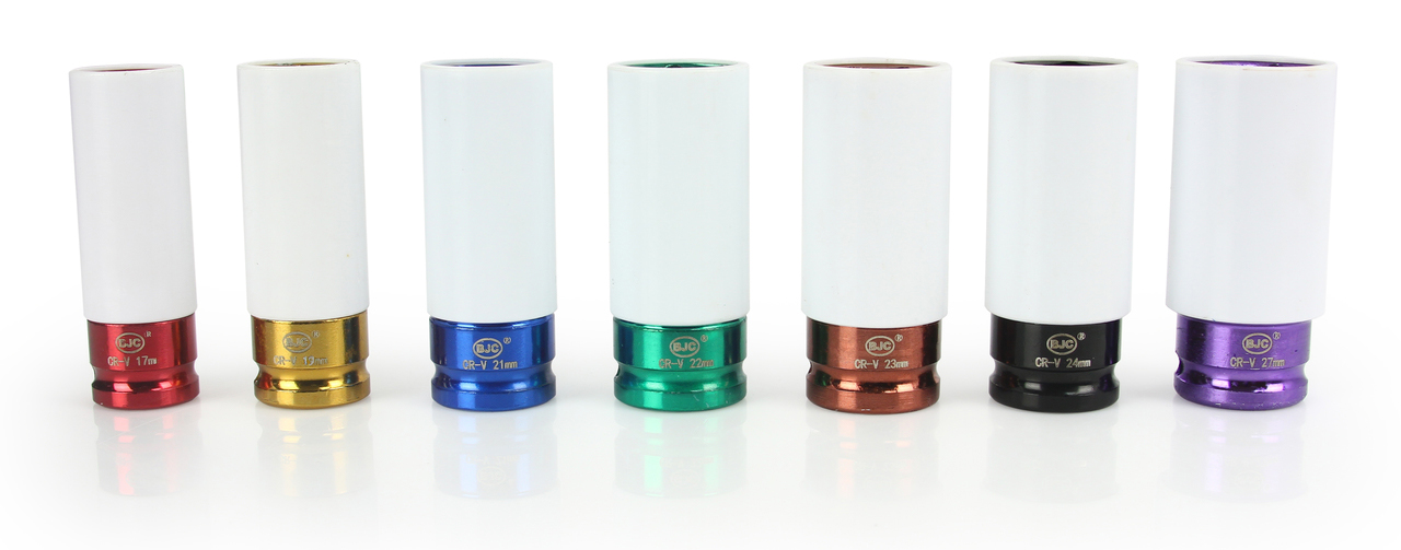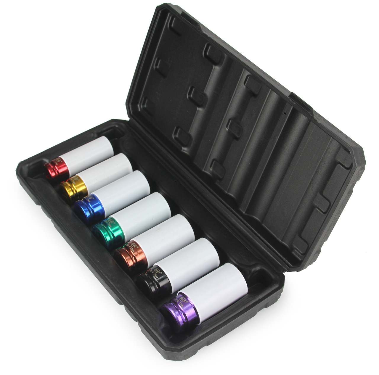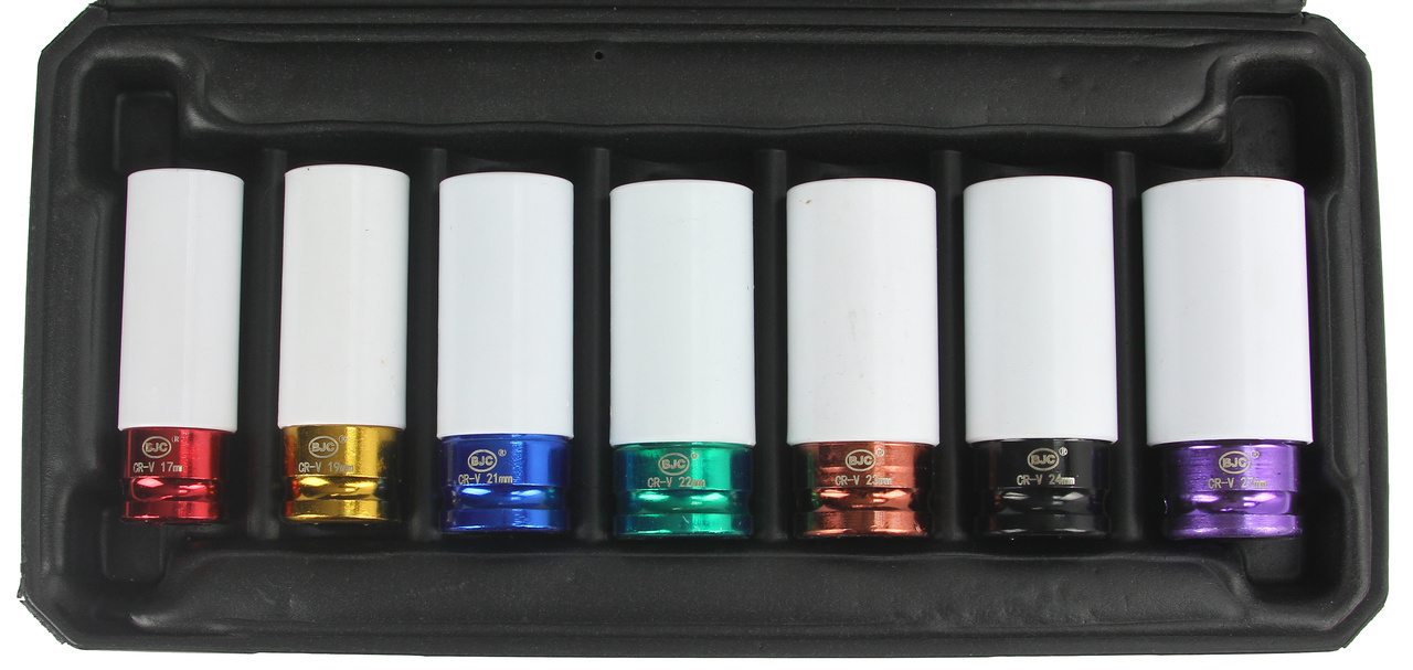 Set di Bussole ad Impatto 1/2" | 7 Pezzi | Colorate | per Cerchi in Lega | Lunghezza 80 mm | Diametro 17-27 mm | con Custodia