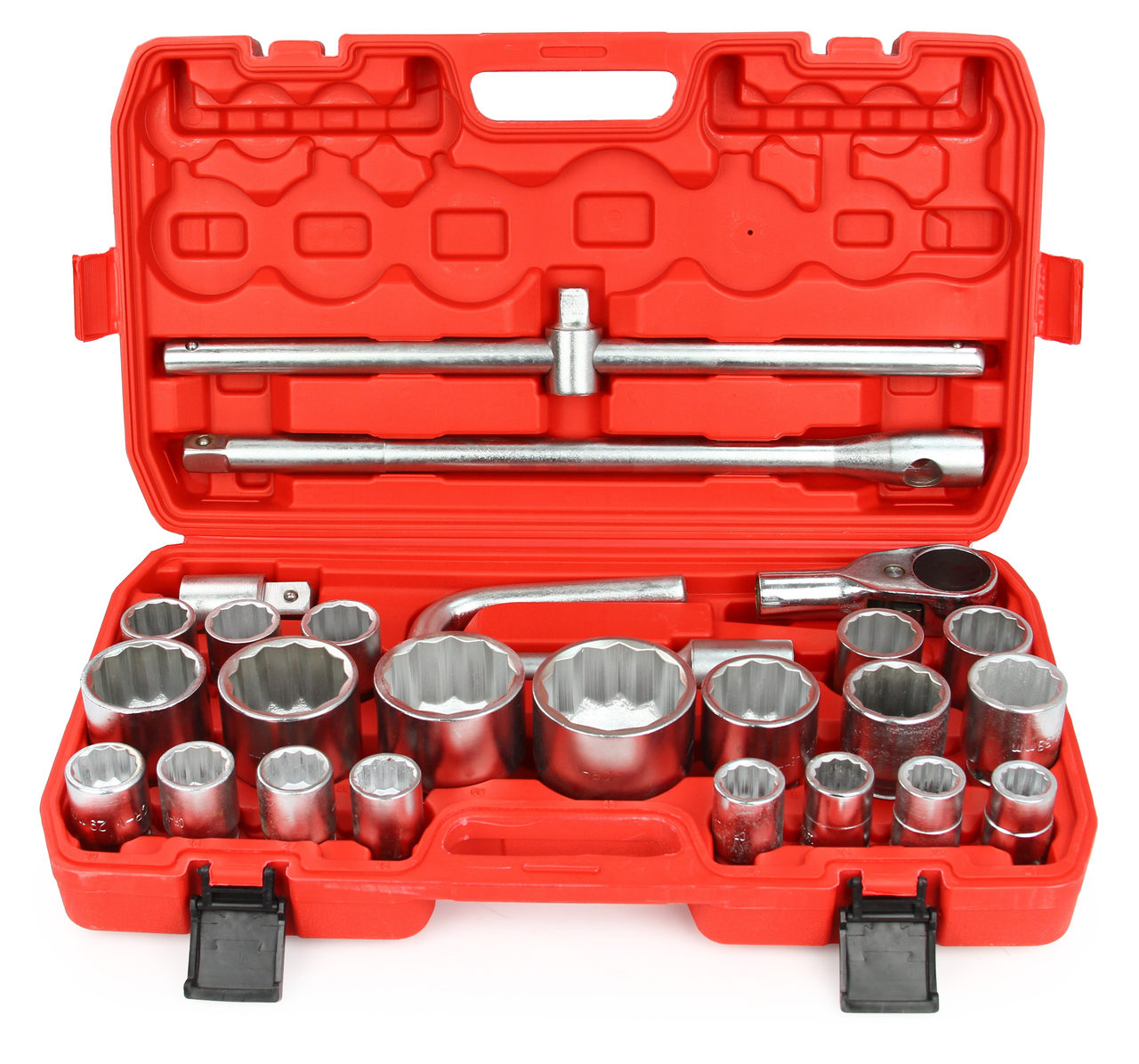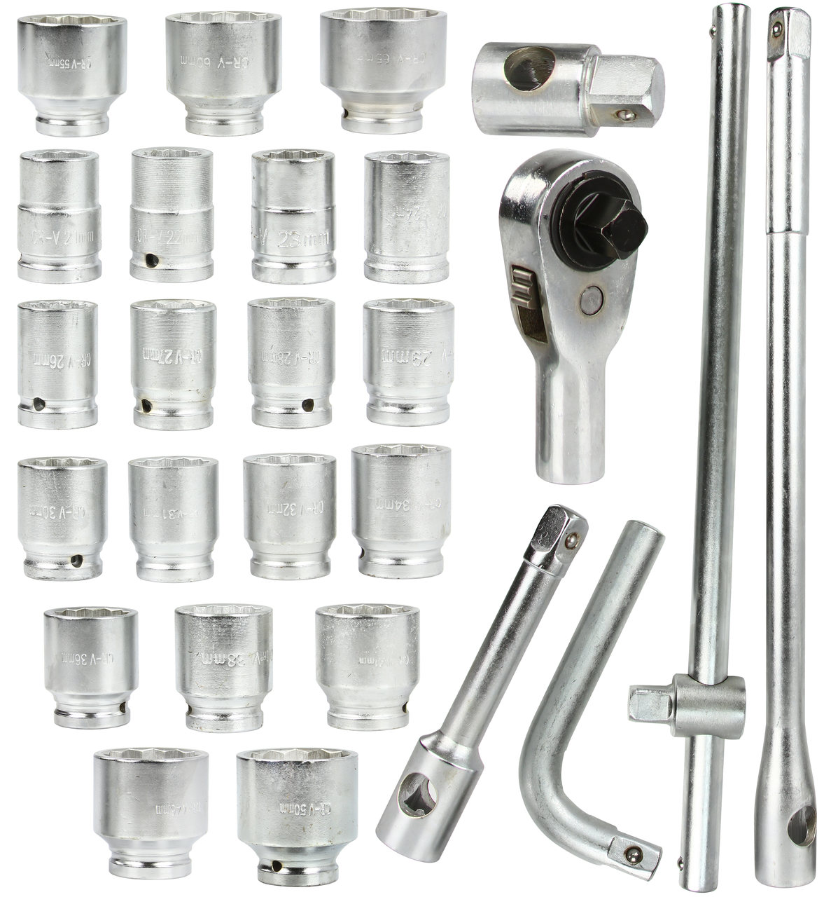 Set di Chiavi a Bussola | 26 Pezzi | 3/4" 21-50 mm | 1" 55-65 mm | Manopola 3/4" | Adattatore | Prolunghe | con Valigetta